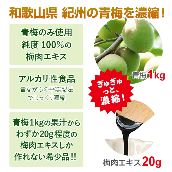 和歌山産の良質の青梅のみを選び、昔ながらの平窯製法でじっくり煮詰めてペースト状に濃縮したアルカリ性食品です。