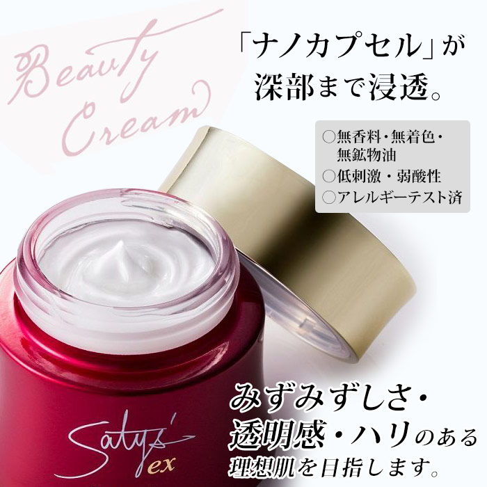 「サティスEX ビューティークリーム」は、選りすぐりの配合成分をナノカプセルに包み込み、お肌の奥深くまで届けます。