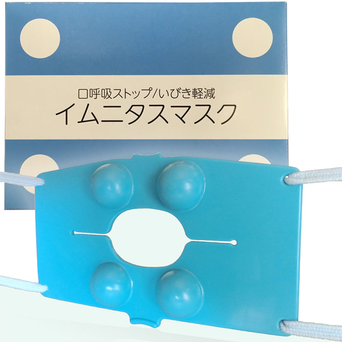 「イムニタスマスク」は、4つの突起が唇の周りの筋肉(口輪筋)に軽い押圧を加えてわずかに緊張させます。歯茎に唇圧を加えることによって、軟口蓋(ノドチンコ)の弛緩や舌根沈下を抑制します。